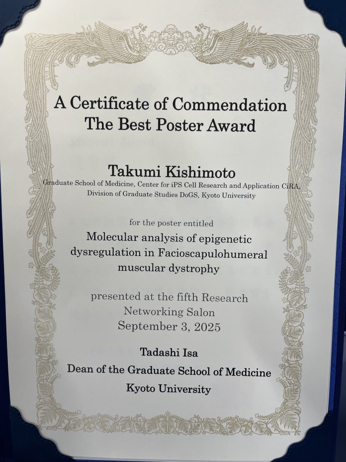 研究 第5回研究交流サロンで博士課程の学生が優秀賞を受賞しました 2025年10月7日 フェイスブックでシェア ツイッターでツイート 最先端の研究を発表し紹介する機会を設ける交流機会として、2020年よリスタートした「研究交流サロン」 医年開連分野の情報交換・共同研究促進を主目的とするポスター発表形式によるサロンで、 今年は、第5回研究交流サロンが、2025/9/3(Wed)・4(Thu) に行われました。 そこで、当研究室、博士課程の岸本拓実さんが The Best Poster Award を受賞されました。 おめでとうございます! 努力は必ず実を結びます、これからも活躍を期待しています。
